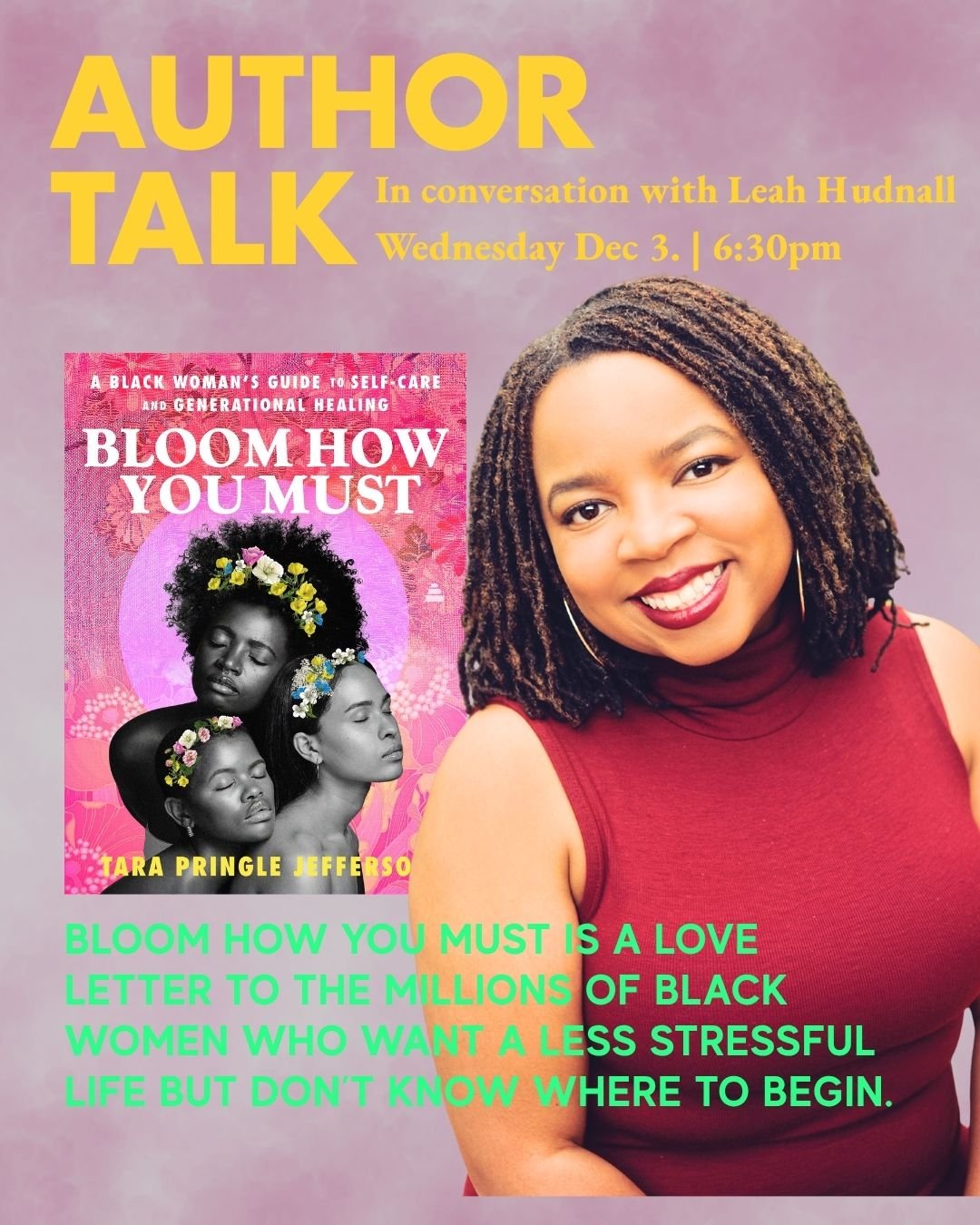 You can purchase her book Bloom How You Must: A Black Woman’s Guide to Self-Care and Generational Healing here before the talk. Select the option to pick up instore and your copy will be there on the day of your event.