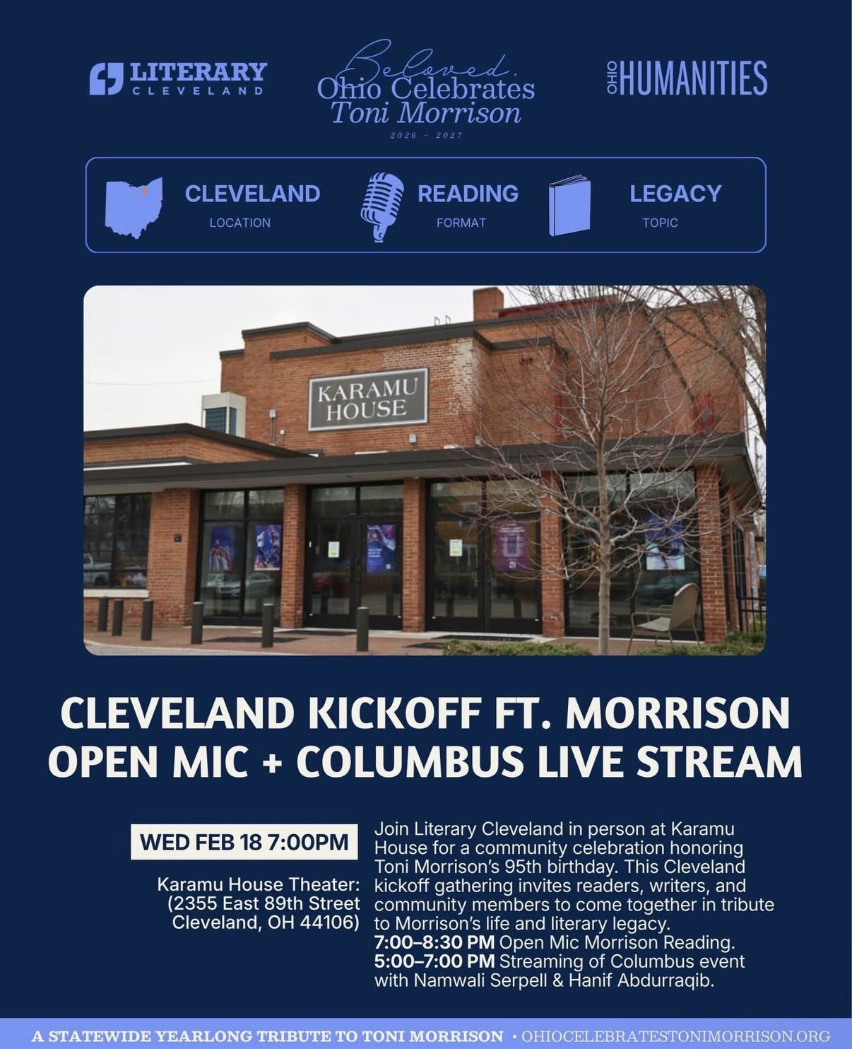 Ohio Celebrates Toni Morrison Kickoff Event Wednesday, February 18, 2026 5:00 PM 8:30 PM Karamu House 2355 E 89th, Cleveland OH 44106 Cleveland, OH, 44106 (map) Google Calendar ICS
