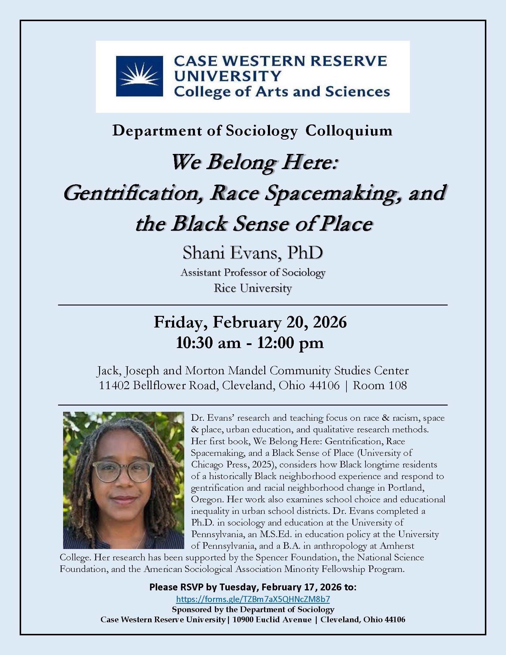 We Belong Here: Gentrification, White Spacemaking, and a Black Sense of Place Friday, February 20, 2026 10:30 AM 12:00 PM ThirdSpace Reading Room 1464 East 105th Street Cleveland, OH, 44106 (map) Google Calendar ICS