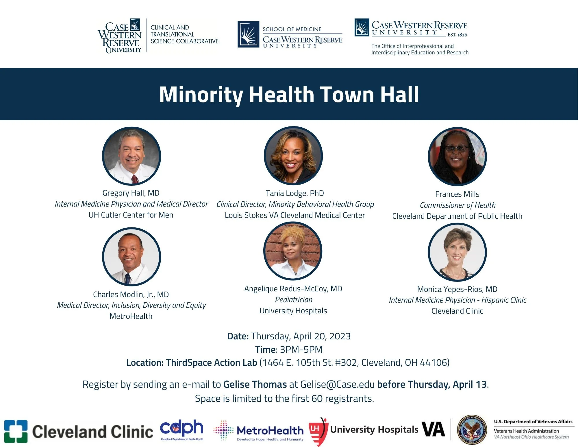 Minority Health Town Hall Thursday, April 20, 2023 3:00 PM 5:00 PM ThirdSpace CLE, LLC. 1464 East 105th Street Cleveland, OH, 44106 (map) Google Calendar ICS Minority Health Town Hall $0.00