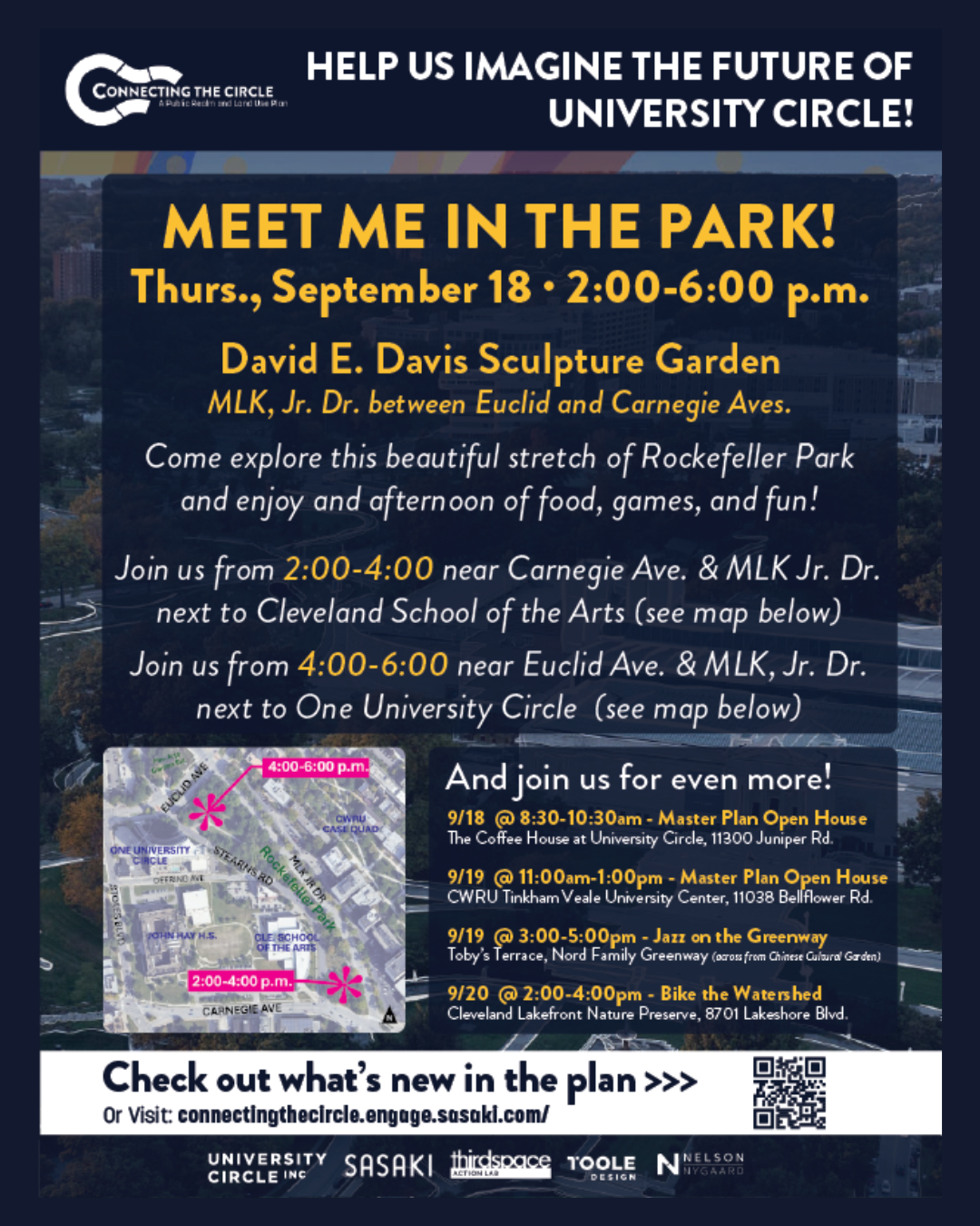 MEET ME IN THE PARK Thursday, September 18, 2025 2:00 PM 6:00 PM ThirdSpace CLE, LLC. 1464 East 105th Street Cleveland, OH, 44106 (map) Google Calendar ICS